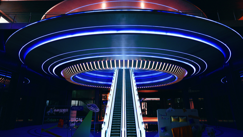 Il 2 novembre 2025, a Nanjing, nella provincia del Jiangsu, la Piazza Disco Volante del Centro Alibaba di Jinling Tiandi, dopo il tramonto, è stata avvolta da luci al neon. La cupola dal design futuristico e le scale mobili come percorsi luminosi formavano un paesaggio notturno da cyberpunk.