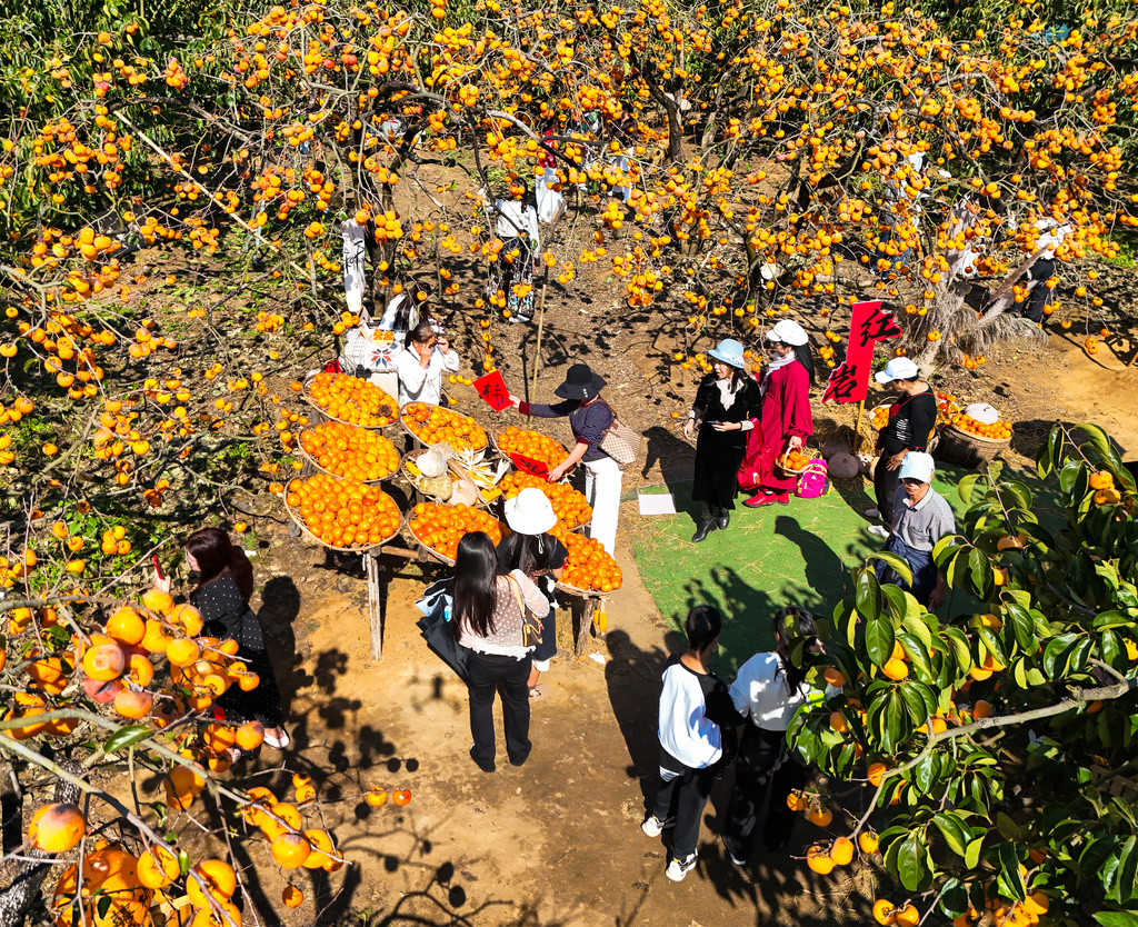 Il 16 novembre nella zona paesaggistica del villaggio Hongyan della contea di Gongcheng, città di Guilin, provincia del Guangxi, i turisti si divertivano a visitare e scattare foto ai boschi di cachi rossi, godendosi il periodo di vacanza. In questi giorni i grandi boschi di cachi del viaggio di Hongyan, che si estendono per una superfice di circa 700 ettari, hanno realizzato un raccolto abbondante. I numerosi cachi rossi appesi a pieno sui rami hanno attirato visitatori provenienti da diverse regioni.