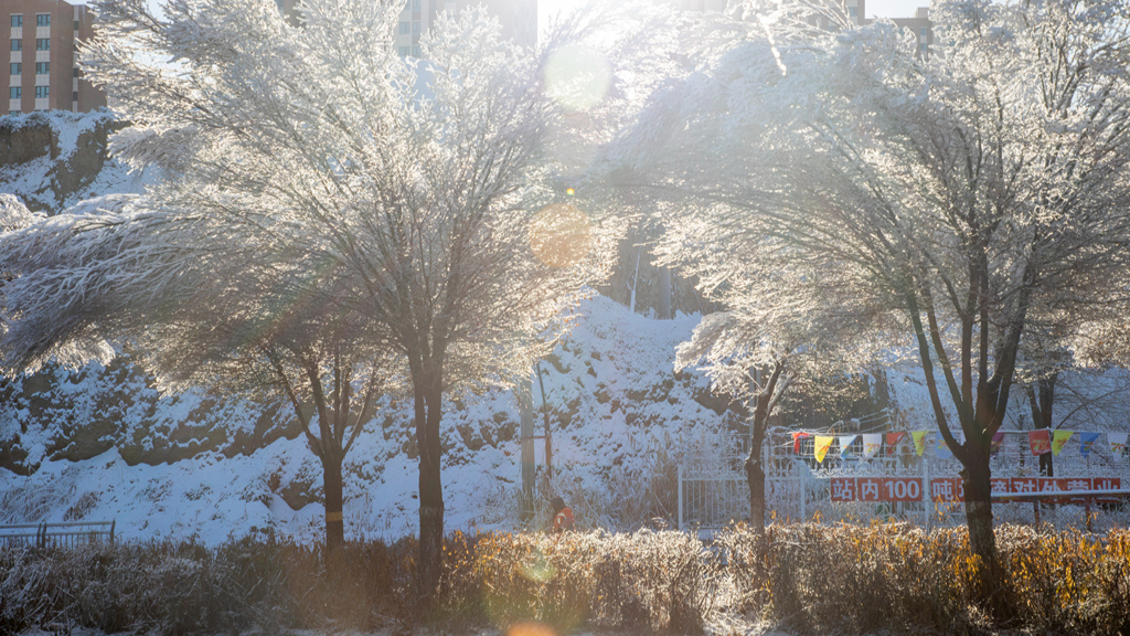 Il 23 novembre 2025, Urumqi (Xinjiang) è stata interessata da una nevicata. Gli alberi, carichi di brina e ghiaccio, creano un paesaggio incantato.