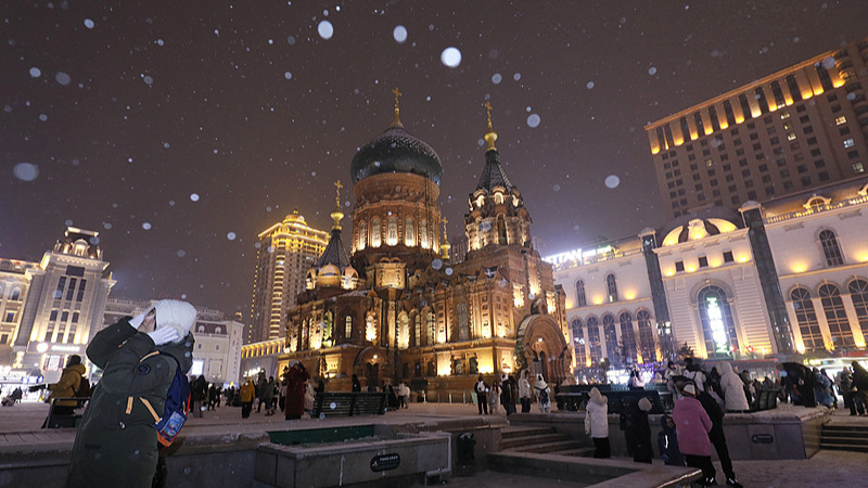 Harbin, paesaggio magico della piazza della Chiesa Sofia tinta dargenta di neve