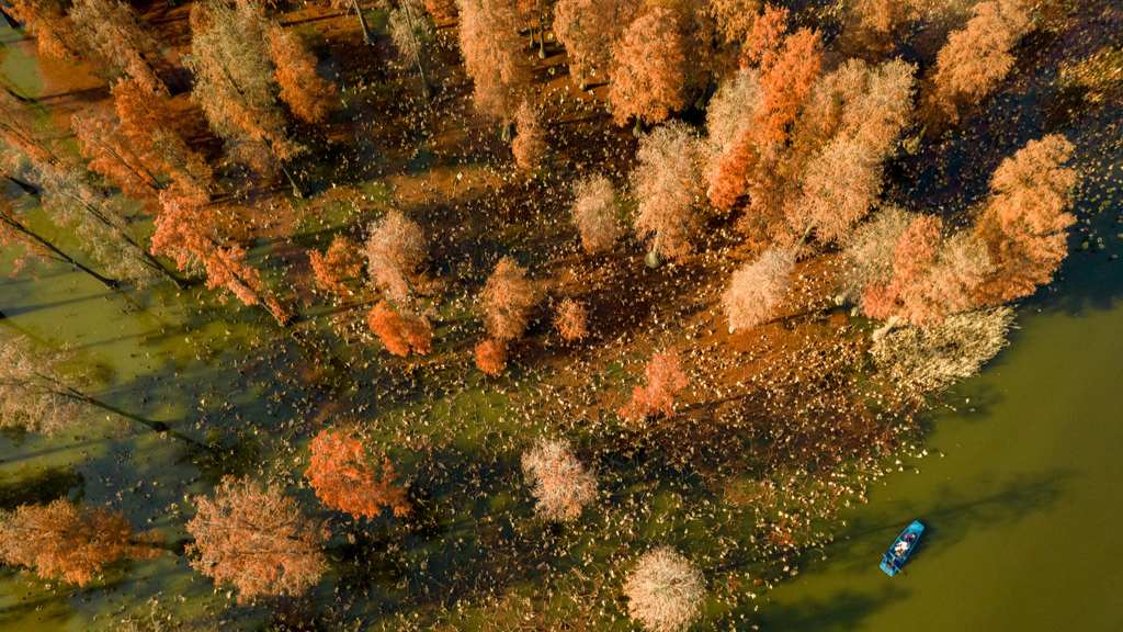 Il 14 dicembre 2025, a Wuhan, nella provincia dello Hubei, la "foresta sull'acqua" della zona umida del Lago Zhangdu, situata nel distretto di Xinzhou, ha offerto uno spettacolo di colori. Diecimila alberi di Taxodium distichum cresciuti in acqua, con le foglie dorate, hanno composto un vivido quadro ecologico. (Foto scattate con drone)
