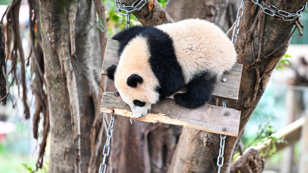 I panda giganti dello Zoo di Chongqing si godono il sole all’aperto