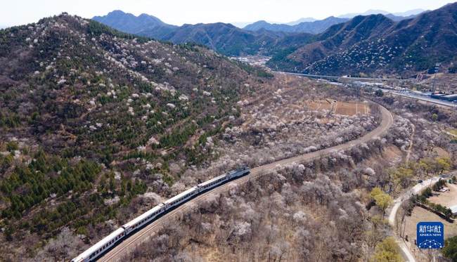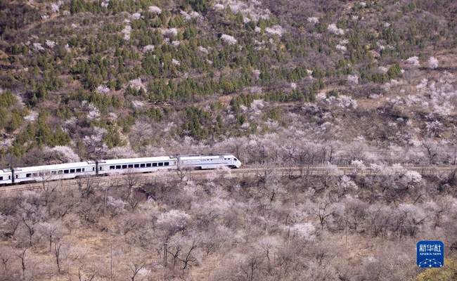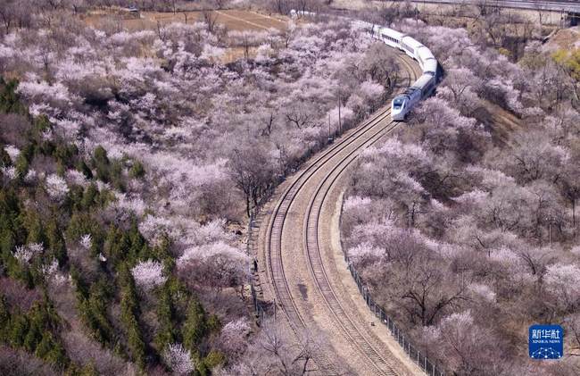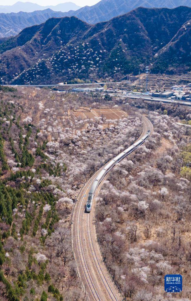 Il 2 aprile, un treno suburbano correva tra i fiori che sbocciavano vicino alla sezione Juyongguan della Grande Muraglia a Beijing, capitale della Cina.
