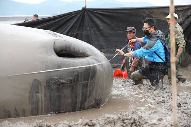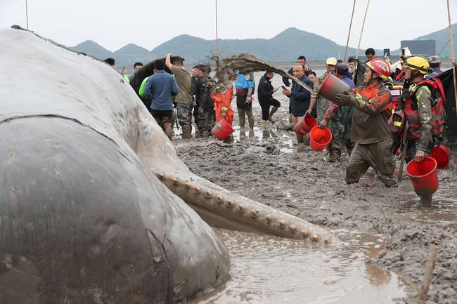 Circa alle 8 della mattina del 19 aprile, vicino alle acque di Banbianshan, contea di Xiangshan, a Ningbo, nello Zhejiang, dei pescatori hanno scoperto questo capodoglio spiaggiato. I dipartimenti dell’amministrazione della pesca, i vigili del fuoco, l’amministrazione marittima e le autorità di pubblica sicurezza hanno avviato subito un’operazione di salvataggio congiunto. A mezzogiorno del 19, le squadre unite di salvataggio hanno provato a disincagliare il capodglio con l’aiuto di un’imbarcazione, ma il salvataggio è stato bloccato a causa del rapido riflusso dell'acqua del mare. Verso le 14:00 il capodoglio era quasi completamente esposto sulle distese di fango. In attesa del flusso della marea, i soccoritori hanno continuato a tenere umidificato il corpo dell’animale con secchi d’acqua, al fine di evitare che la sua pelle potesse creparsi per la disidratazione provocata dalla lunga esposizione all’aria.