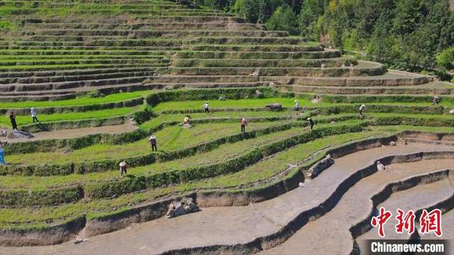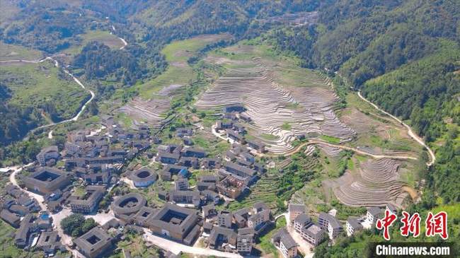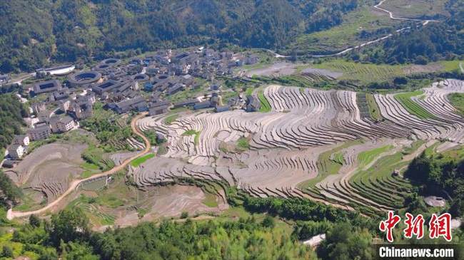 Nel distretto di Yongding di Longyan, città della provincia del Fujian, i campi terrazzati di colore grigio-marrone si vestono di “verde”, il che delinea con i tradizionali edifici Tulou (architettura di terra) attorno un paesaggio pastorale pieno di atmosfera rustica.