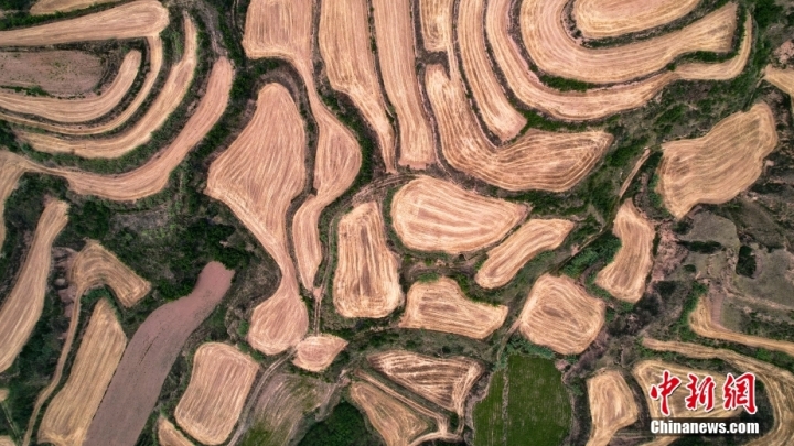 Nel distretto di Ruicheng della provincia dello Shanxi, dopo la mietitura del grano locale, le tracce lasciate da mietitrici sui terrazzamenti sembrano gli anelli annuali dei grandi alberi
