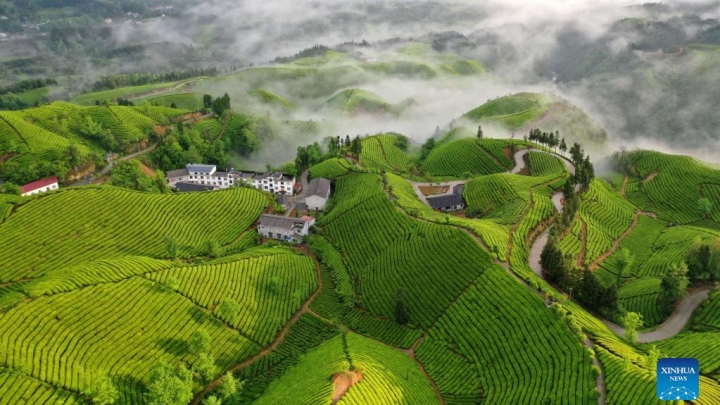 Negli ultimi giorni, nella città di Zouma, nella prefettura autonoma di Enshi Tujia e Miao, nella provincia di Hubei, un paesaggio costituito da decine di migliaia di acri di terreno coltivato a tè e il cielo sovrastante appaiono come un mare di tè dipinto in un rotolo