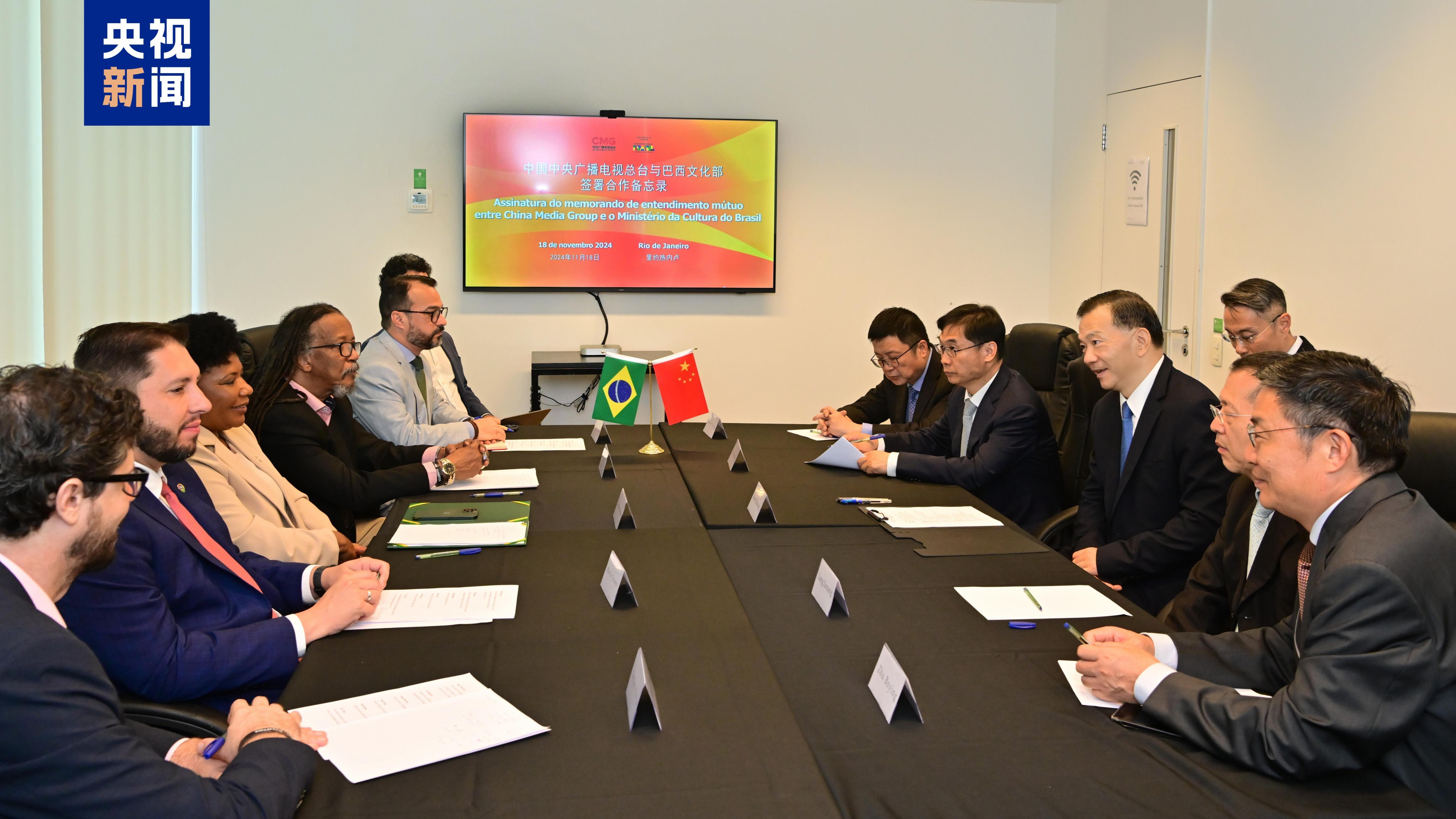 Il 18 novembre, ora locale a Rio de Janeiro, China Media Group e il Ministero brasiliano della Cultura hanno firmato un memorandum di cooperazione. Le due parti hanno raggiunto un accordo nei settori della produzione di programmi audiovisivi, della diffusione del patrimonio culturale e dello scambio di personale e tecnologie. Il presidente del China Media Group, Shen Haixiong, e la ministra brasiliana