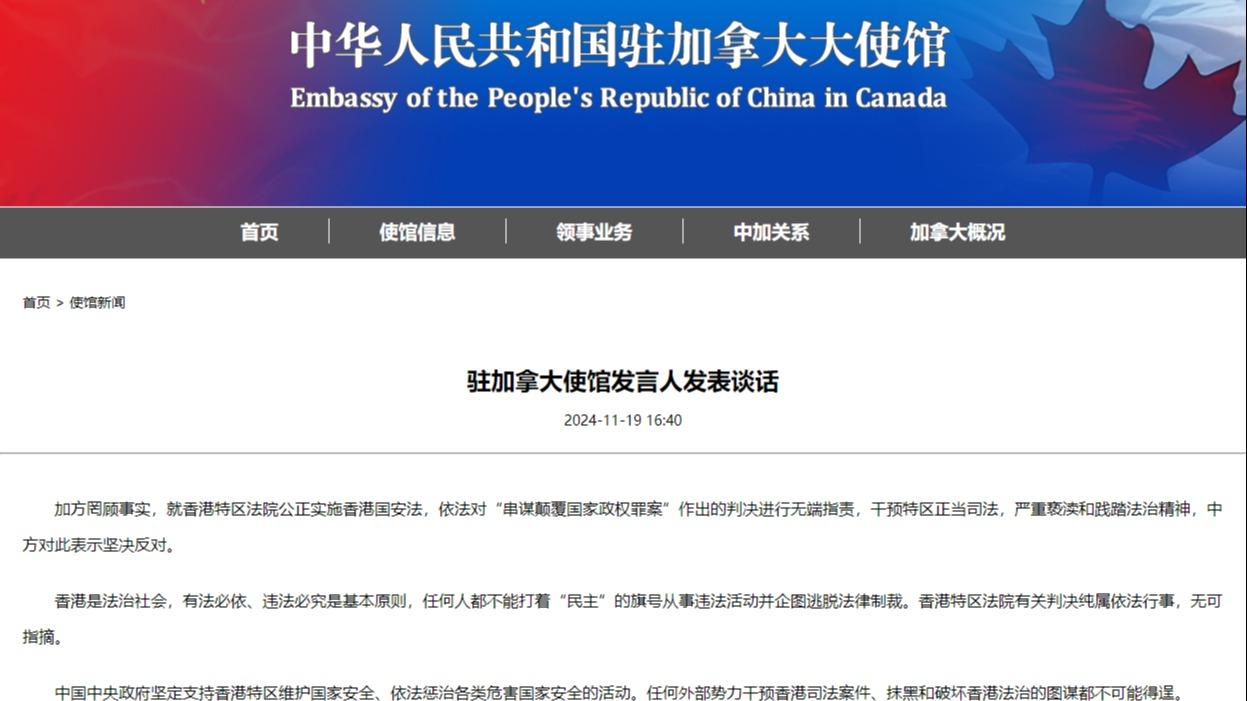 In un discorso del 19 novembre, il portavoce dell’Ambasciata cinese in Canada ha affermato che, ignorando i fatti, la parte canadese ha irragionevolmente lanciato accuse contro la Corte della Regione ad amministrazione speciale di Hong Kong per aver applicato la legge della Repubblica popolare cinese sulla salvaguardia della sicurezza nazionale nella RAS di Hong Kong e aver sentenziato su un caso di