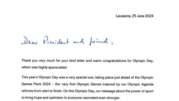 Il 25 giugno, il presidente del Comitato Olimpico Internazionale, Thomas Bach, ha risposto al direttore della China Media Group (CMG) ringraziandolo per le congratulazioni inviate in occasione della Giornata Olimpica 2024. Bach ha espresso la speranza di collaborare con CMG per promuovere un successo straordinario per le Olimpiadi di Parigi.Bach ha affermato che la Giornata Olimpica di quest'anno cade